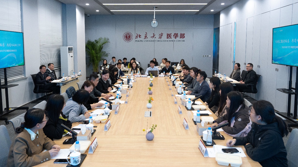 春风拂面,万物复苏,北医学子带着寒假的收获与思考重返校园。为了解同学们的寒假生活状态、学习收获及新学期精神风貌,引导和帮助同学们尽快完成从假期到新学期的过渡,3月23日晚,医学部学生工作部在医学部科技楼一层会议室举办2026年学生寒假见闻座谈会。医学部党委副书记杨莉出席会议,医学部学生工作部、人民武装部部长俞荔琼,医学部团委书记陈磊,医学部学生工作部、人民武装部副部长张红梅,医学部研究生院副院长闫婕、教育处副处长杨岸蒲、保卫处副处长潘建超、后勤党委副书记江书省,基础医学院党委副书记郑凌冰,护理学院党委副书记张进瑜及医学部各学院(含医学预科)师生代表参会。座谈会现场,师生畅谈寒假所见所闻,分享所思所想,共同展望新学期新征程。座谈会由医学部学生工作部副部长张静主持。