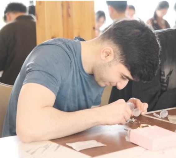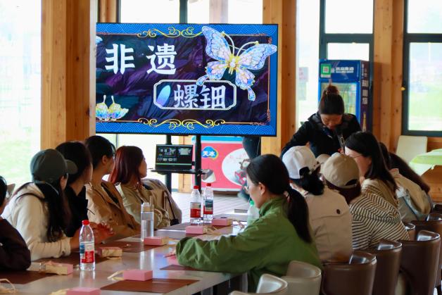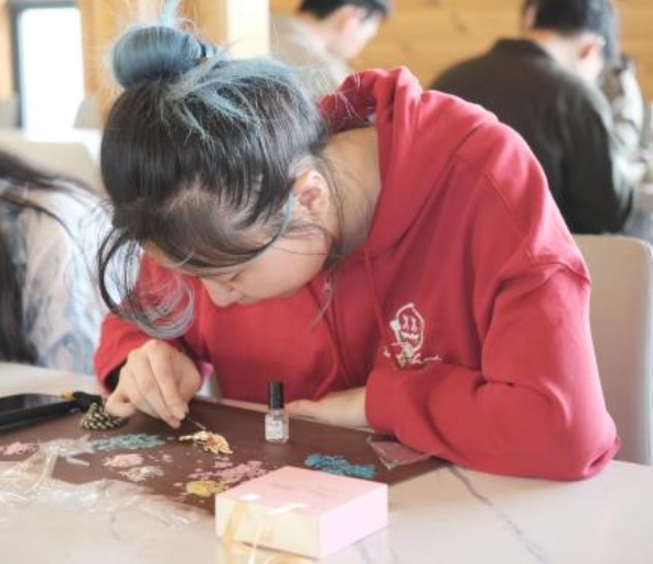 非遗螺钿体验区,同学们将贝壳薄片一片一片镶嵌在木质底托上。一位同学说道:“刚开始觉得好难,但慢慢静下来之后,发现挺有意思的。当碎片一点点拼成一朵花的时候,特别有成就感。”