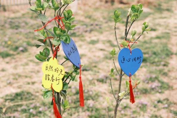同学们与树苗合影并留下自己的许愿牌