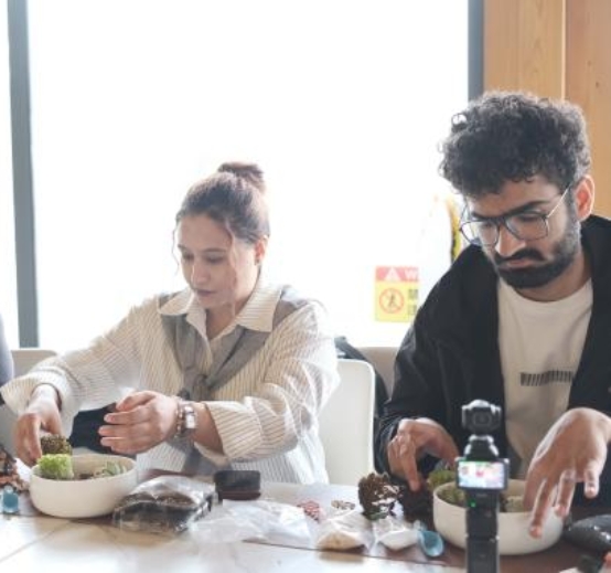 多肉盆栽制作区,同学们将多肉植物、砂石、小摆件等巧妙搭配,在陶瓷花盆中搭建出一个个微型世界。一位同学一边用小镊子仔细摆放苔藓一边说:“做这个的时候脑子里什么都不想,只盯着眼前这一小块地方,特别放松。”