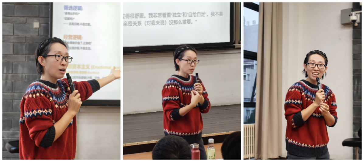 徐红红开场即以“当前情感状态调查”提问,引起全场同学共鸣,并深入探讨当代大学生的两种单身心理——“享受型单身”与“防御性单身”。据近期北大新青年公众号对部分北大学生的恋爱情况调查显示,超27%的调查对象“母胎单身”,本次讲座前的问卷调查结果也表明学生对如何开始和维系恋爱关系面临着不同困惑。她结合心理学理论和个案,分析了恐惧亲密关系的深层原因:对高投入、低回报的担忧,以及对以“价值”“标准”衡量关系的“情感资本主义”的抵触。