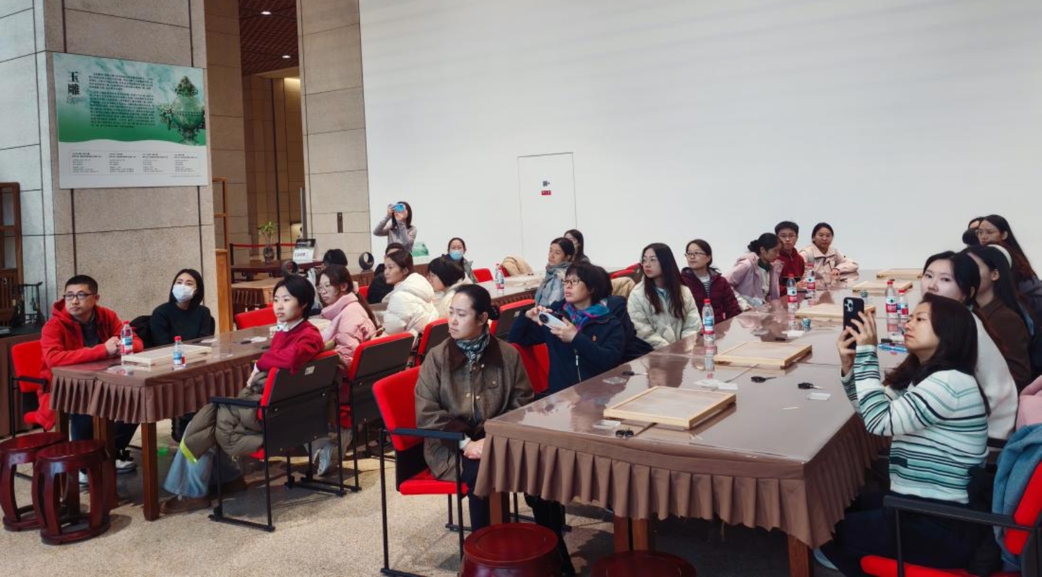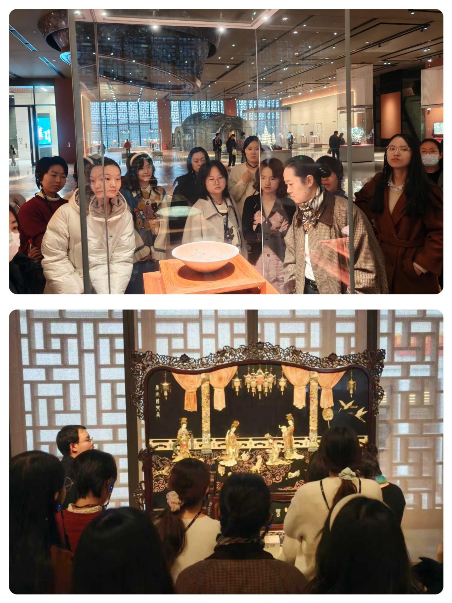 在醒香过程中,师生们怀着敬畏与求知的心情,走进了“文脉华滋”基本陈列展厅。这里荟萃了玉雕、石雕、木雕、陶瓷、染织、漆器等众多门类的工艺美术瑰宝,堪称一部立体的中国工艺发展史。讲解过程按历史事件顺序推进,从新石器时期的质朴陶器,到现当代的手工艺品;从气势恢宏的大型组雕,到巧夺天工的微型杰作,每一件展品都无声地诉说着中华民族的智慧、审美追求与时代精神。大家流连于各个展区,时而为古代匠人鬼斧神工的技艺惊叹,时而为作品背后蕴含的深厚文化内涵与美好寓意所折服。大家深刻感受到,中华文明之所以博大精深、源远流长,正是因为有着这样一代代手工艺人,以匠心守护文脉,以巧思延续华章,将民族的记忆、情感与智慧熔铸于一件件器物之中,构筑起中华民族独特的精神标识和文化基因。